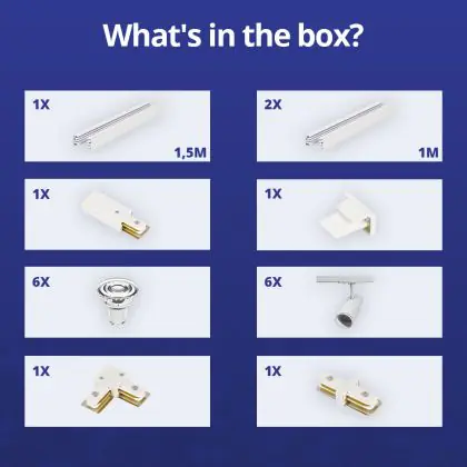| Fabrikantnaam | Complete L shaped 1-Phase Track Set White incl. 6x Spot fixture + GU10 2700K 3W Dim – 1.5 x 2 meters | |