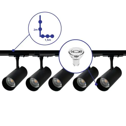 Bright Choice Complete Set 1-Fase Rail L 1,5 x 2 Meter Zwart | incl. 5x Spot + GU10 2700K 3W Dimbaar + Eindkap, Voedingsconnector en L -Verbindingsstuk