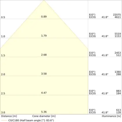 De gradenbundel geeft informatie over hoe breed het licht wordt uitgestraald. Dit zit tussen de 0 en 360 graden (D). Hoe kleiner de hoek, hoe specifieker de lichtbundel is. Over het algemeen is een smalle gradenbundel perfect voor sfeer- of accentverlichting, terwijl een brede gradenbundel ideaal is om grote oppervlaktes te verlichten.