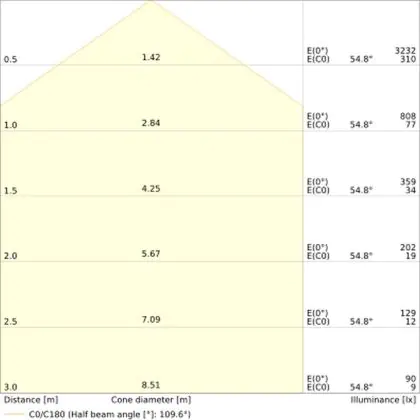 De gradenbundel geeft informatie over hoe breed het licht wordt uitgestraald. Dit zit tussen de 0 en 360 graden (D). Hoe kleiner de hoek, hoe specifieker de lichtbundel is. Over het algemeen is een smalle gradenbundel perfect voor sfeer- of accentverlichting, terwijl een brede gradenbundel ideaal is om grote oppervlaktes te verlichten.