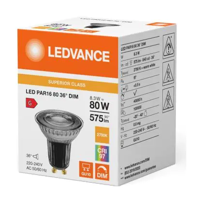 Beschrijving Ledvance LED PAR16 GU10 Reflector 8.3W 575lm 36D - 927 Zeer Warm Wit | Beste Kleurweergave - Dimbaar - Vervangt 80W