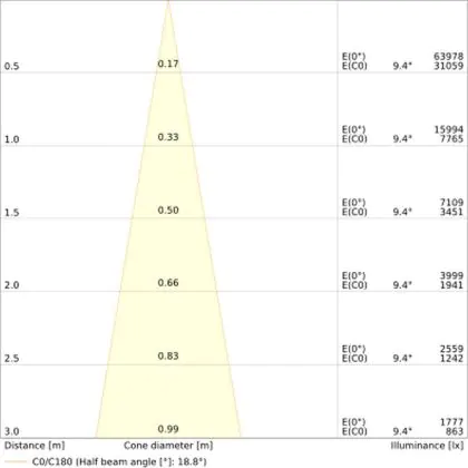 De gradenbundel geeft informatie over hoe breed het licht wordt uitgestraald. Dit zit tussen de 0 en 360 graden (D). Hoe kleiner de hoek, hoe specifieker de lichtbundel is. Over het algemeen is een smalle gradenbundel perfect voor sfeer- of accentverlichting, terwijl een brede gradenbundel ideaal is om grote oppervlaktes te verlichten.
