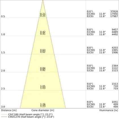 De gradenbundel geeft informatie over hoe breed het licht wordt uitgestraald. Dit zit tussen de 0 en 360 graden (D). Hoe kleiner de hoek, hoe specifieker de lichtbundel is. Over het algemeen is een smalle gradenbundel perfect voor sfeer- of accentverlichting, terwijl een brede gradenbundel ideaal is om grote oppervlaktes te verlichten.