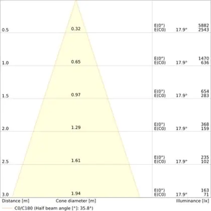 De lichtopbrengst en de gradenbundel spelen een grote rol. Zo geeft de lichtopbrengst van 680 Lumen in combinatie met de 36° stralingshoek deze inbouwspot een specifieke toepassing. Kort samengevat is een lichtintensiteit van maximaal 400 Lumen ideaal voor accentverlichting, terwijl hogere waardes goed gebruikt kunnen worden als basisverlichting. Over het algemeen geldt: hoe breder de gradenbundel, hoe geschikter deze is door basisverlichting. Dit komt doordat het licht over een groter oppervlak wordt verspreid. Smallere gradenbundels (tot 40°) kunnen echter bij hoge plafonds ook goed tot hun recht komen als algemene verlichting.
