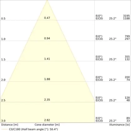 De lichtopbrengst en de gradenbundel spelen een grote rol. Zo geeft de lichtopbrengst van 840 Lumen in combinatie met de 60° stralingshoek deze inbouwspot een specifieke toepassing. Kort samengevat is een lichtintensiteit van maximaal 400 Lumen ideaal voor accentverlichting, terwijl hogere waardes goed gebruikt kunnen worden als basisverlichting. Over het algemeen geldt: hoe breder de gradenbundel, hoe geschikter deze is door basisverlichting. Dit komt doordat het licht over een groter oppervlak wordt verspreid. Smallere gradenbundels (tot 40°) kunnen echter bij hoge plafonds ook goed tot hun recht komen als algemene verlichting.